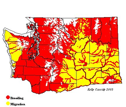 Yellow Warblers breed all over Washington in appropriate habitat, but are most common in streamside thickets in the eastern Washington lowlands. They breed in western Washington as well, where appropriate habitat remains, but are less common in the western Olympic Peninsula, as there is not much deciduous habitat in that part of the state. Yellow Warblers are common in Washington from May through mid-August. They are sighted uncommonly through the end of September.